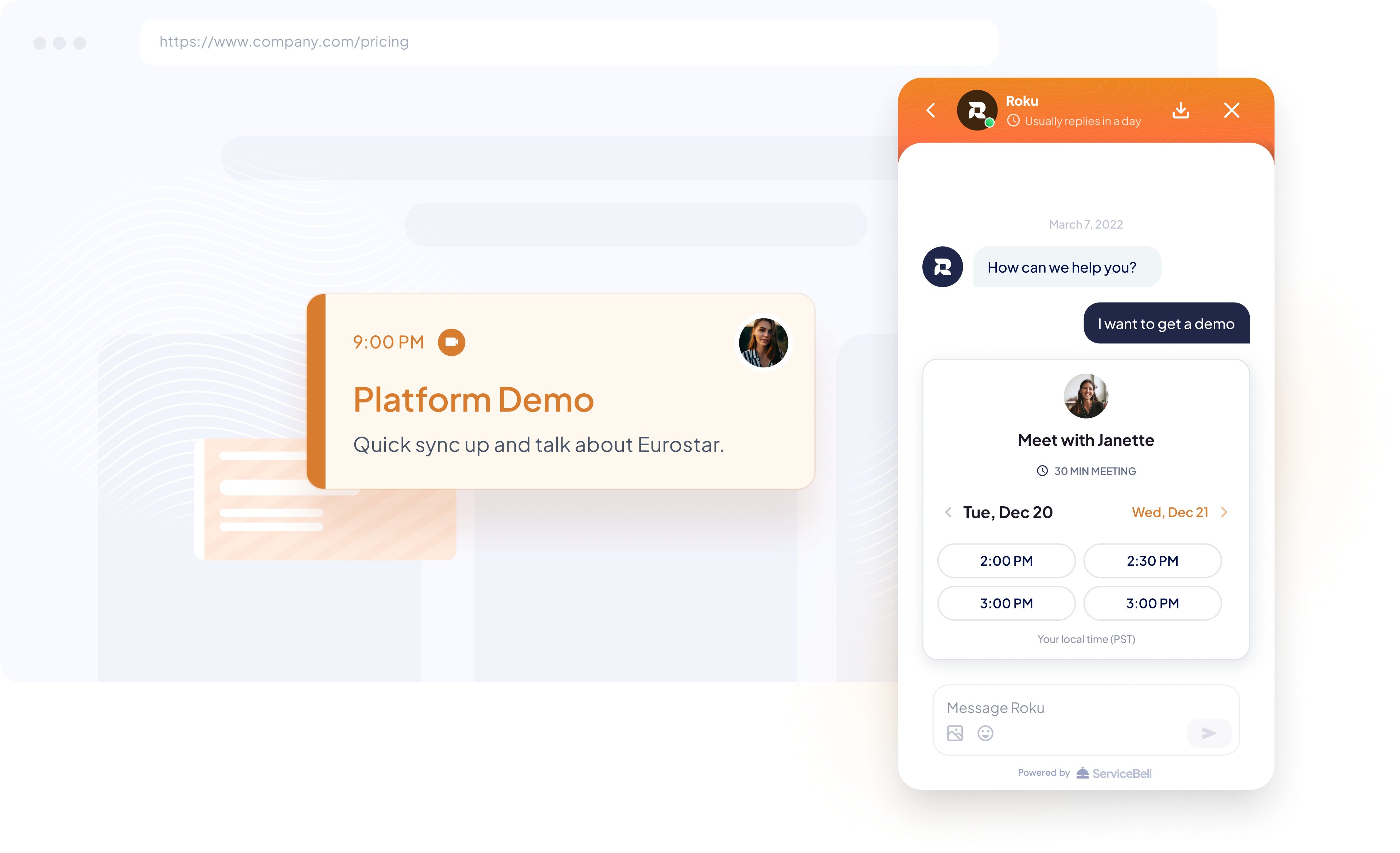 ServiceBell’s scheduler lets you build round robin or personal meeting links, sync with your calendar, and deliver through chat or anywhere.